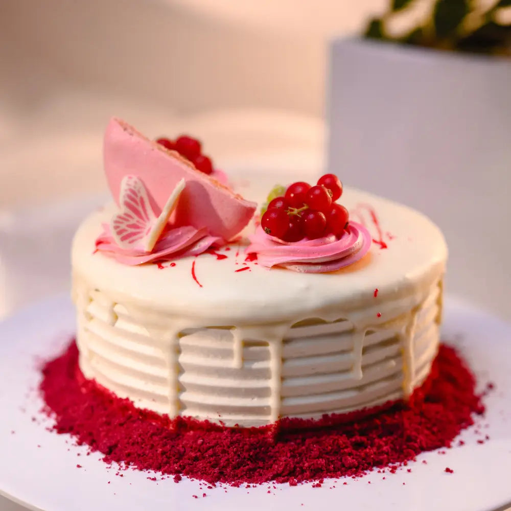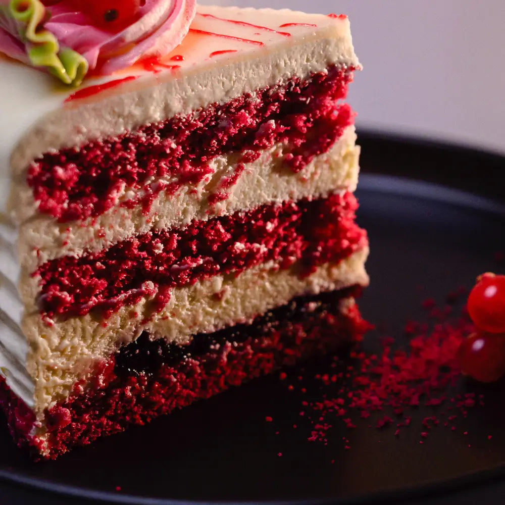 Ingrediente: blat Red Velvet fin și însiropat, mousse de mascarpone cu vanilie bourbon, strat de dulceață de vișine ușor acrișoară, cremă de brânză cu smântână dulce, decor din fulgi de ciocolată albă și inimioare din ciocolată roșie.